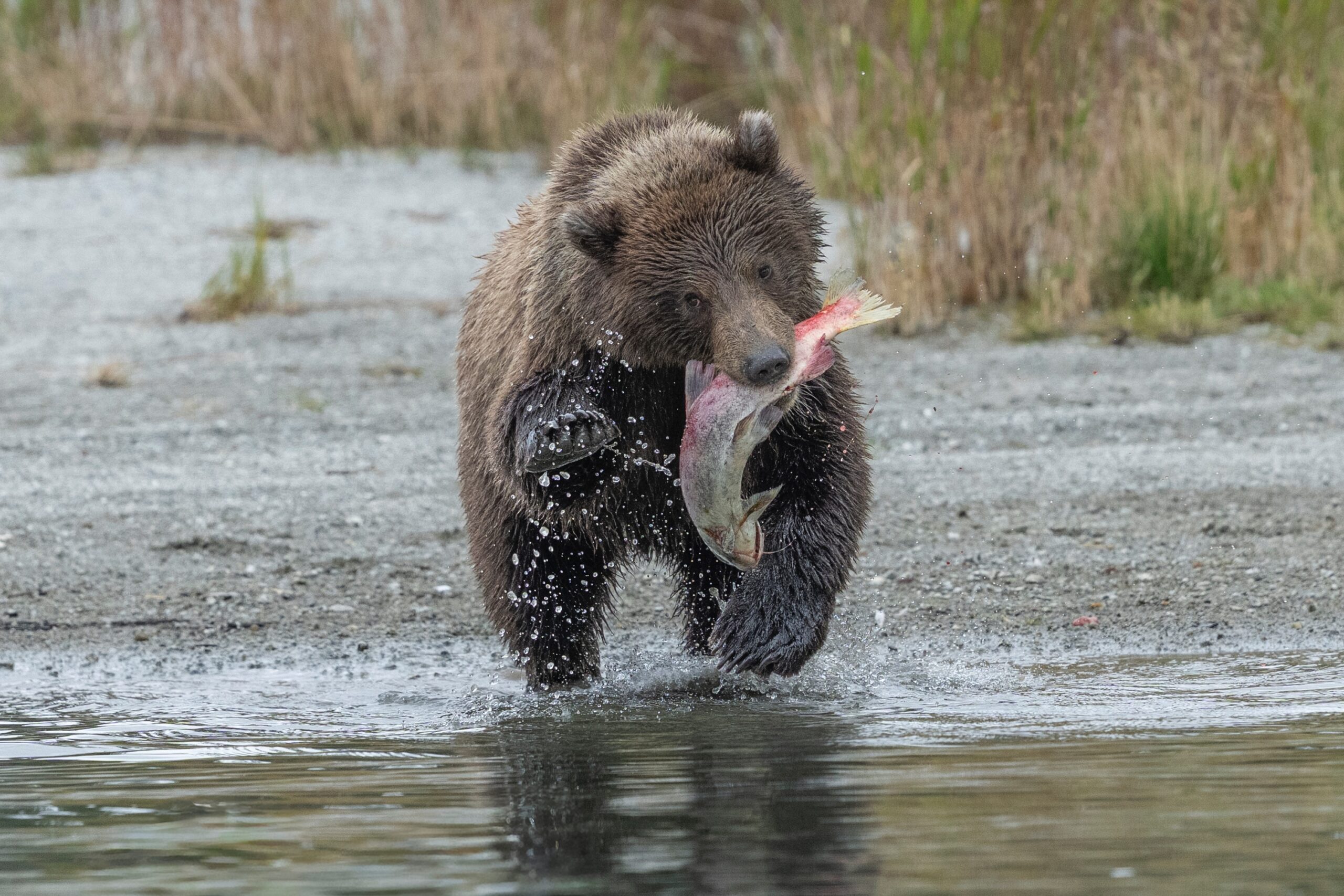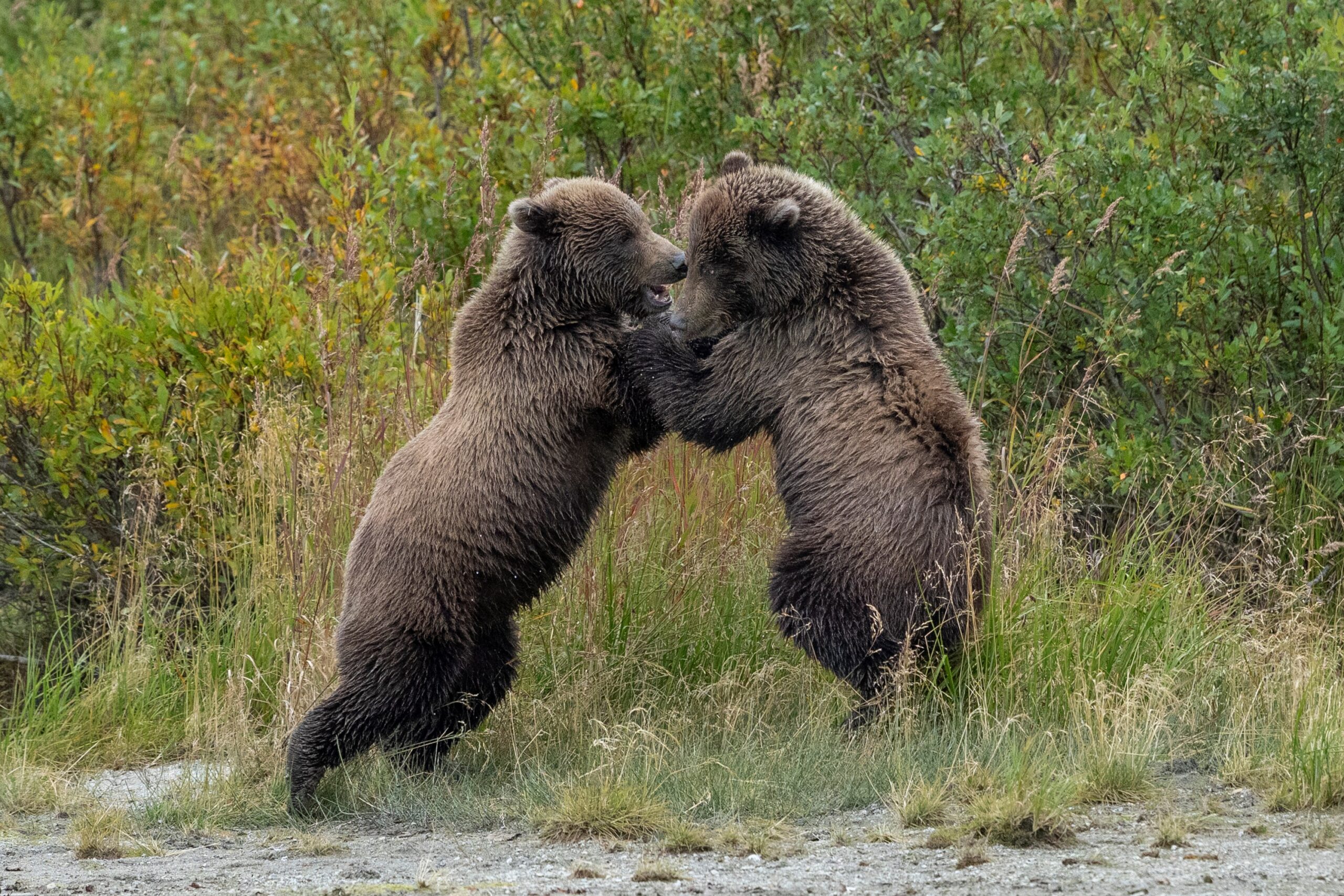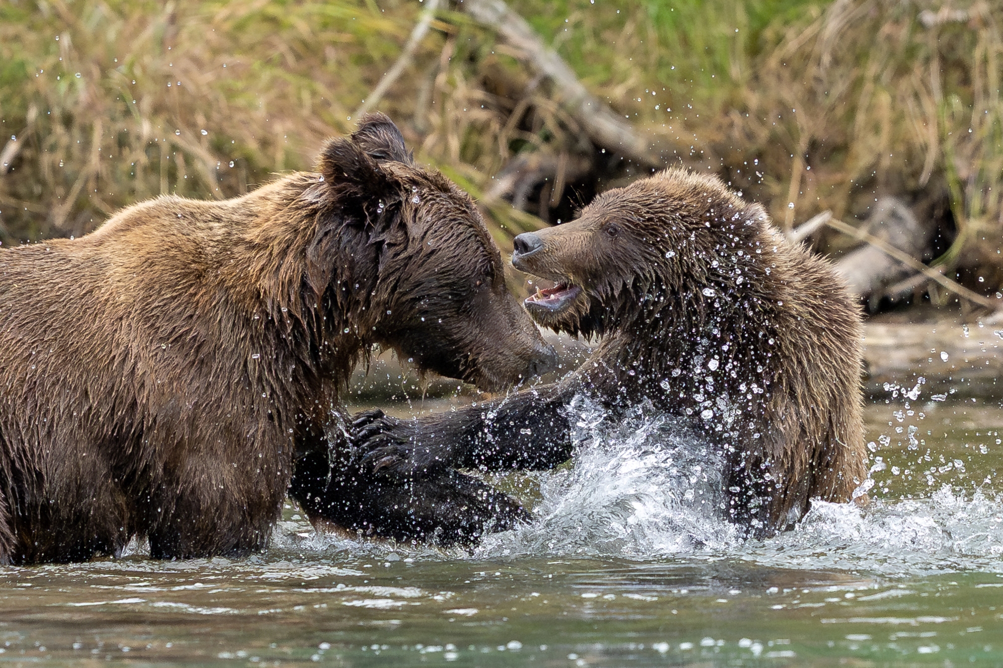 Die jährliche Lachswanderung vom Meer zurück zu den hochgelegenen Laichplätzen in den Seen Alaskas bildet eine der Hauptnahrungsquellen der Bären. Es war faszinierend, im Lake Clark Nationalpark die Grizzlies dabei zu fotografieren, wie sie sich ins Wasser stürzten und geschickt einen Fisch nach dem anderen für sich und die Jungen an Land brachten. Und die Jungen erproben derweil ihre Kräfte.